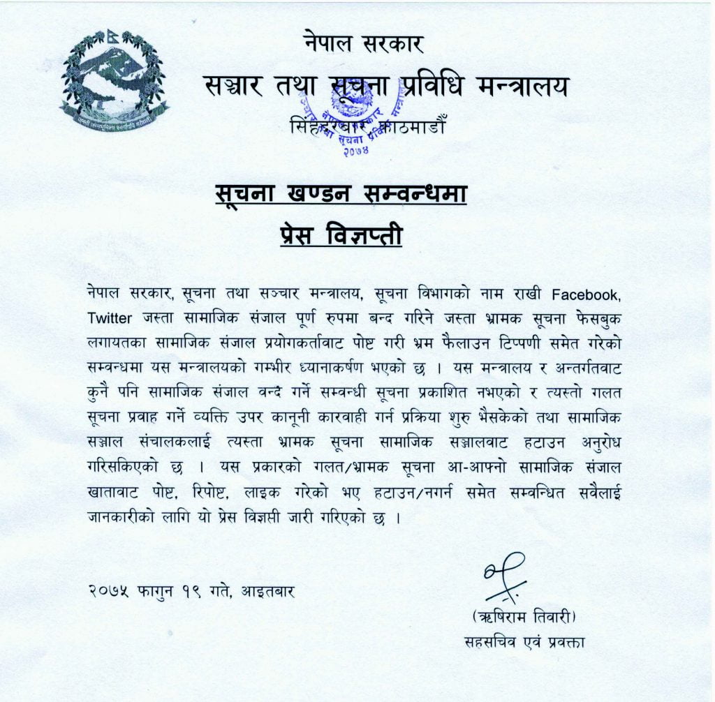 मन्त्रालयका सह–सचिव एवं प्रवक्ता ऋषिराम तिवारीले एकआइतवार विज्ञप्ति जारी गरी मन्त्रालय, सूचना विभागको नाम राखी फेसबुक र ट्वीइटरजस्ता सामाजिक सञ्जाल पूर्णरुपमा बन्द गरिनेजस्ता भ्रामक सूचना फेसबुकलगायतका सामाजिक सञ्जाल प्रयोगकर्ताबाट पोष्ट गरी टिप्पणीसमेत गरिएको सम्बन्धमा गम्भीर ध्यानाकर्षण भएको विज्ञप्तिमा जनाइएको छ ।