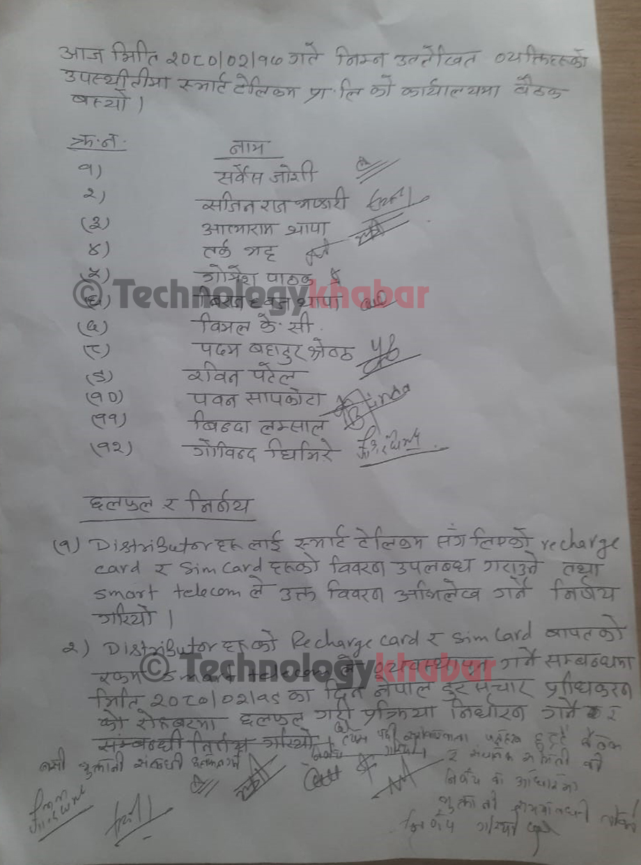 ललितपुरस्थित स्मार्ट टेलिकमको मुख्यालयमा रिचार्ज कार्ड व्यवसायीहरुसँगको सहमतिमा रिचार्ज कार्डको तथ्यांक संकलन गर्ने र रकम भुक्तानीको लागि पहल गर्ने निर्णय भएको हो।
