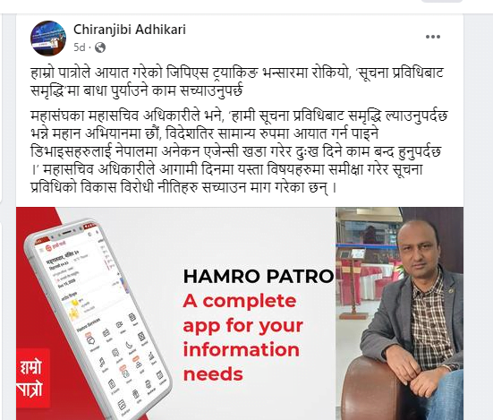 महासचिव अधिकारीले आफ्नो फेसबुक वालमा यहि विषय सम्बन्धित एक समाचार सेयर गर्दै सरकारले अनावश्यकरुपमा अनेकन एजेन्सी खडा गरेर दुःख दिने गरेको गंभिर आक्षेप लगाएका छन्।