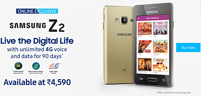 सामसंगले सार्वजनिक गरेको जेड टू फोन सामसंगको यो डिभाइसका लागि भारतमा एक्सक्लुसिभ अनलाइन पार्टनर पेटिएमले (Paytm) फोन बिक्रीमा राखेको छ । बिक्रीमा राखिएको अफरअनुसार यो स्मार्टफोनको खरिदमा रिलायन्स जीयोको फोरजी भ्वाइस तथा डाटा ९० दिनसम्मको निशुलल्क प्राप्त गर्न सकिनेछ । अनलाइनमा यो स्मार्टफोनको मूल्य भारु ४,५९०/- अर्थात करिब ७ हजार ४ सय नेपाली रुपैंया तोकिएको छ । यो स्मार्टफोन गोल्ड, ब्ल्याक, रेड वाइन कलरमा उपलब्ध हुनेछ ।