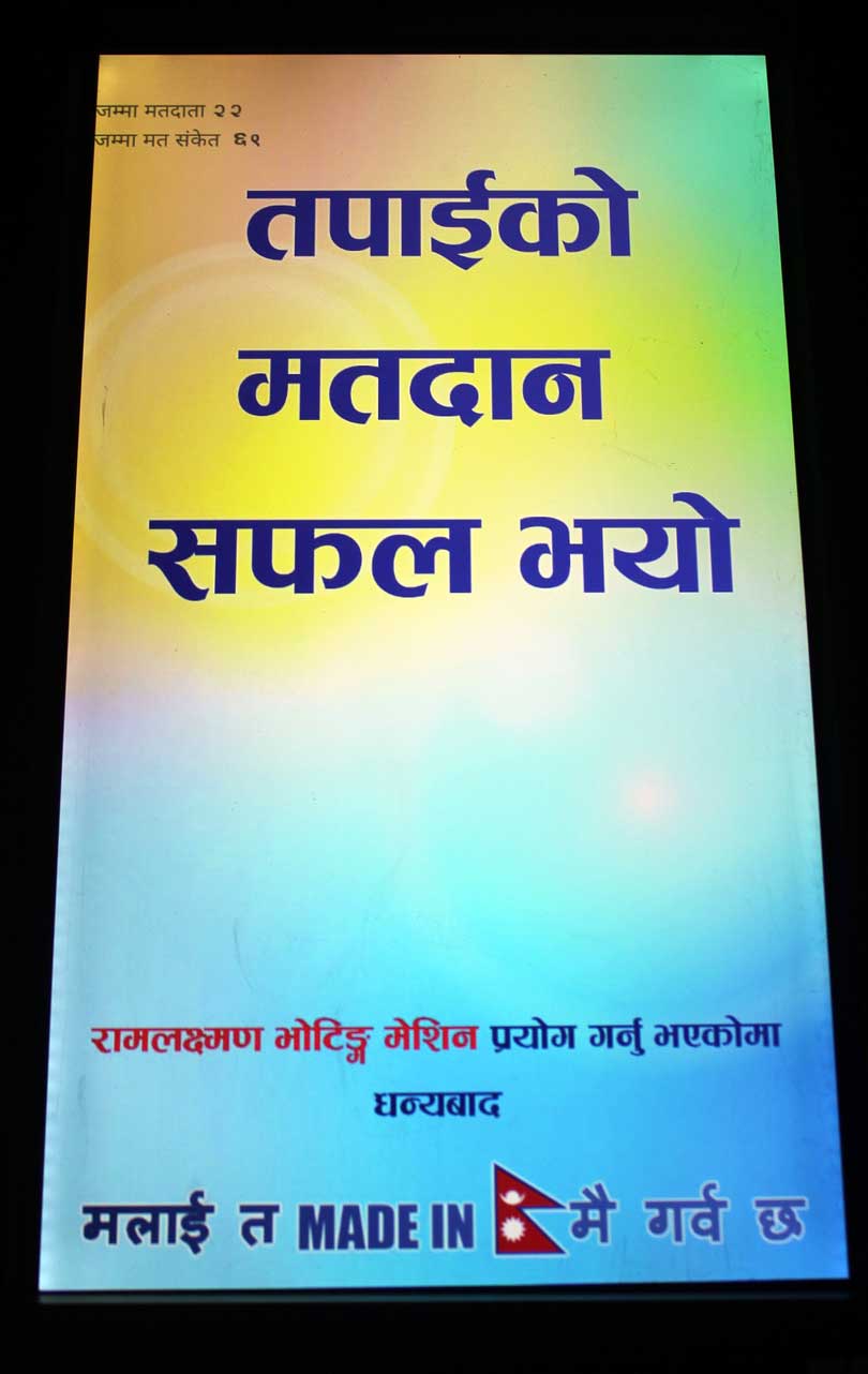 काठमाडौं, ३ मंसिर। नेपाली अनुसन्धानकर्ताहरुले बनाएको विद्युतिय भोटिङ्ग मेसिनले निर्वाचन आयोगबाट अझै अनुमति प्राप्त गर्न सकेको छैन् । नेपाली अनुसन्धानकर्ताहरु रामलक्ष्मण रिमालले स्वेदशी श्रम र सिपमा बनाएको विद्युतिय भोटिङ्ग मेसिनले आयोगबाट अनुमति नपाउँदा अझैपनि कागजी मतपत्रद्धारा मतदान गर्नुपर्ने अवस्था रहेको छ ।
