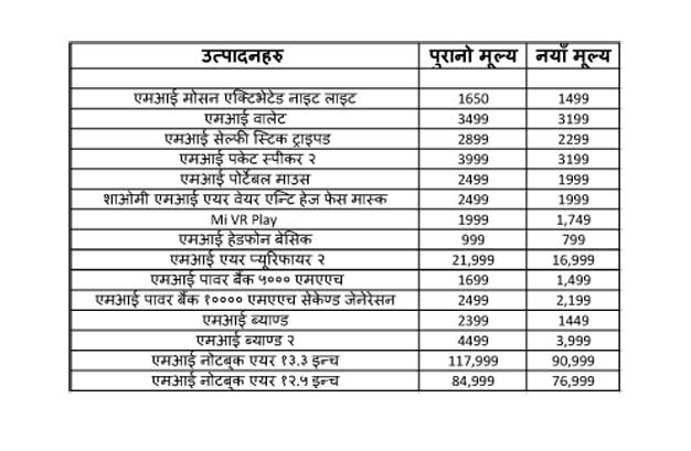 शाओमीले नेपाली बजारमा उपलब्ध, एमआई मोसन एक्टिभेटेड नाइट लाइट, एमआई वालेट, एमआई सेल्फी स्टिक ट्राइपड, एमआइ पकेट स्पीकर २, एमआइ भिआर प्ले, एमआई हेडफोन बेसिक, एमआई एयर प्यूरिफायर २, एमआई पावर बैंक ५००० एमएएच, एमआइ पावर बैंक १०,००० एमएएच सेकेण्ड जेनेरेशन, एमआई ब्याण्ड, एमआई ब्याण्ड २, एमआई नोटबुक एयर १३.३ इन्च र एमआई नोटबुक एयर १२.५ इन्चको मूल्य घटाएको हो ।