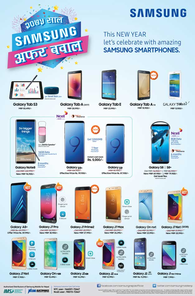 काठमाडौं । सामसङले नयाँ वर्ष २०७५ आगमनलाई लक्षित गर्दै आफ्नो “२०७५ साल सामसङ अफर बबाल” घोषणा गरेको छ ।