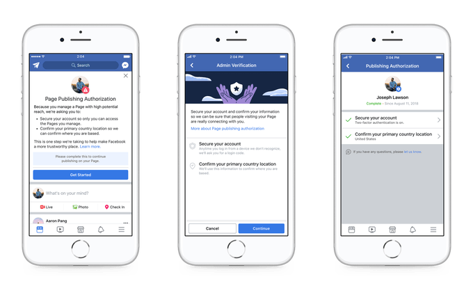 फेसबुकले शुक्रबार पेज एडमिनिस्ट्रेटरका लागि पेज पब्लिसिंग अर्थोराइजेसन (Page publishing authorization) प्रकृयामार्फत मात्र पेज संचालन गर्न सकिने भएको हो । यो प्रकृयामा पेज म्यानेजरहरुले उनीहरुको एकाउन्टलाई सुरक्षित पार्नुपर्नेछ भने उनीहरुले पेज संचालन गर्ने लोकेशन पनि प्रमाणित गर्नुपर्ने छ ।
