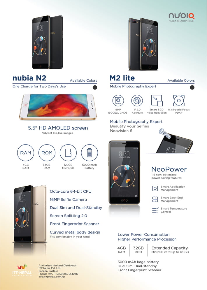 काठमाडौं । आई.टि.पि नेपाल प्रालिले नेपाली बजारमा चार मोडलका नुविया स्मार्टफोनहरु सार्वजनिक गरेको छ । कम्पनीले एम टू लाइट(M2 lite), एन टू(N2), जेड सेभेन्टिन मिनी(Z17 Mini), जेड सेभेन्टिन मिनी एस (Z17 Mini S) स्मार्टफोन बिक्री शुरु गरेको हो ।