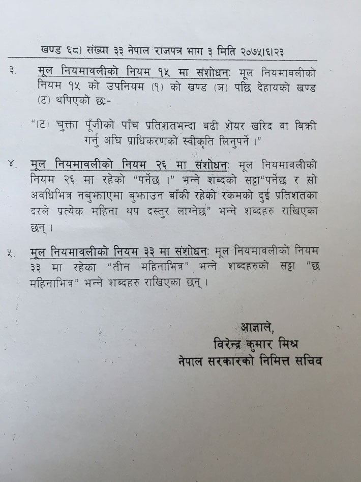 मन्त्रालयले सो नियमलाई संसोधन गर्दै ‘पर्नेछ भन्ने शब्दको सट्टा पर्नेछ र सो अवधिभित्र नबुझाएमा बुझाउन बाँकि रहेको रकमको दुई प्रतिशतका दरले प्रत्येक महिना थप दस्तुर लाग्नेछ,’ भन्ने शब्दहरु राखिएको छ ।