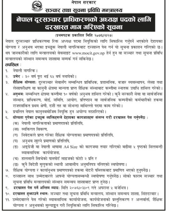 अध्यक्षको पदका लागि योग्यता पुगेका व्यक्तिहरुले सूचनाअनुसारको विबरणहरुसहित मन्त्रालयमा आवेदन दिन सक्नेछन् ।