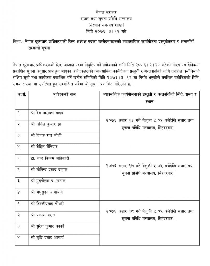 यसअघि मन्त्रालयले जेठ २७ गते नेपाल दूरसंचार प्राधिकरणमा रिक्त अध्यक्ष पदको लागि आवेदन माग गर्दै सार्वजनिक सूचना प्रकाशित गरेको थियो ।