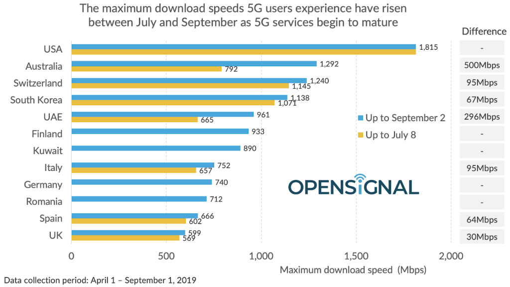यी देशहरुमध्ये सबैभन्दा स्पीड बढि भएका देशहरुमा मिड ब्याण्ड ५जी स्पेक्ट्रम जोडिएको छ, जसमा ३.४ देखि ३.८ गीगाहर्ज छ भने ५जीको लागि नै उच्च गतिका एमएमवेब अमेरिकी अपरेटरहरुले अहिलेसम्म प्रयोग गरेका छैनन् ।