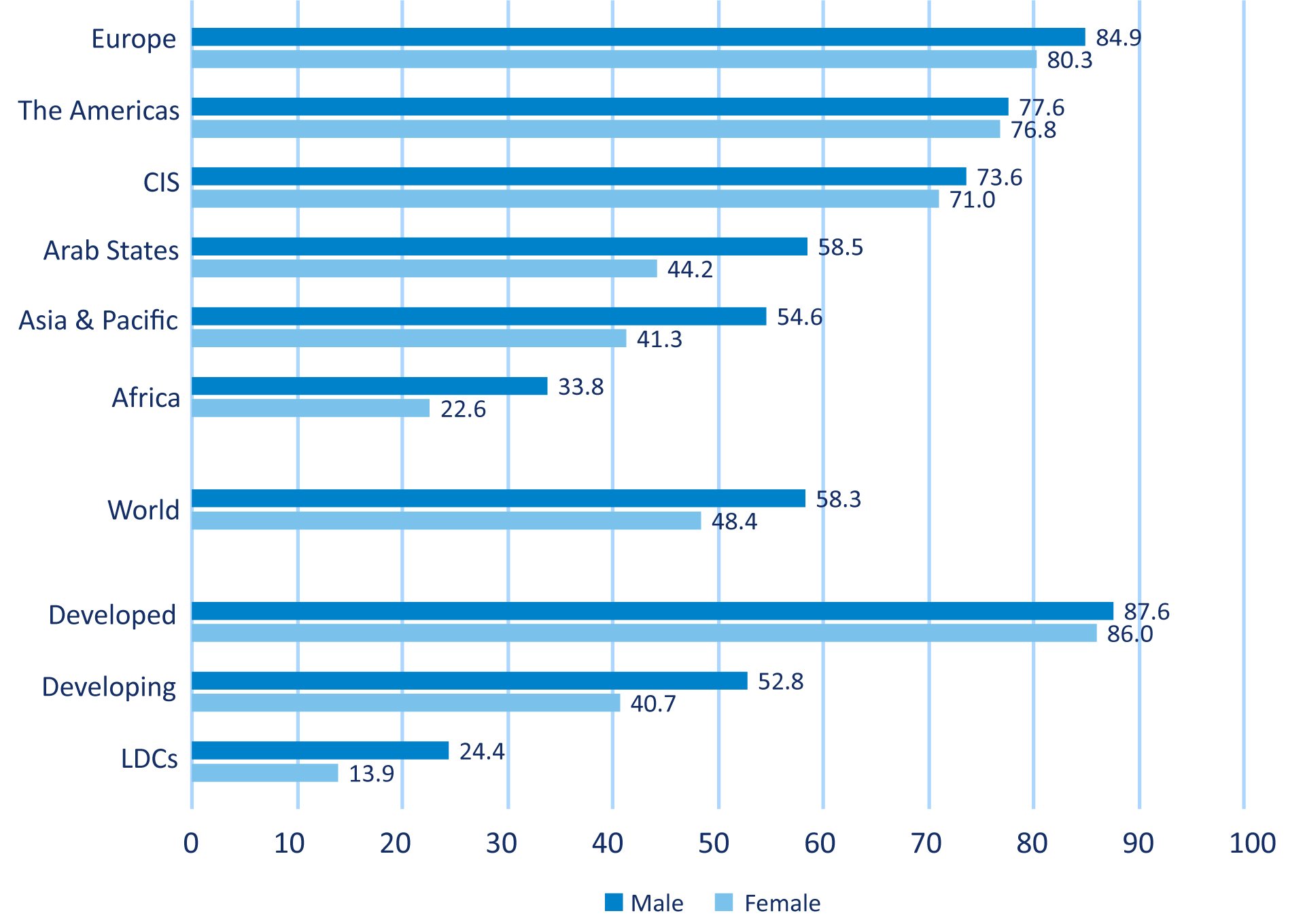 विश्वभरीका महिलाहरुमध्ये ४८ प्रतिशतले मात्र इन्टरनेट प्रयोग गर्ने गरेका छन भने पुरुषहरुमध्ये ५८ प्रतिशतले इन्टरनेट प्रयोग गरिरहेका छन् ।