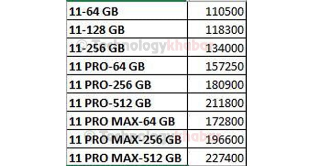 टेक्नोलोजीखबरलाई प्राप्त नेपाली बजार मूल्यअनुसार सबैभन्दा सस्तो भनिएको आइफोन ११ को ६४जीबी स्टोरेजको मूल्य १ लाख १० हजार ५०० रुपैयाँ निर्धारण गरिएको छ । आइफोन ११ को १२८ जीबीको मूल्य १ लाख १८ हजार ३०० रुपैयाँ र २५६ जीबी स्टोरेजको मूल्य १ लाख ३४ हजार तोकिएको छ ।