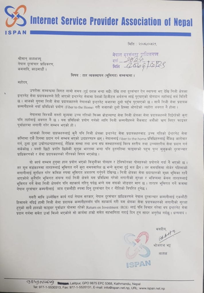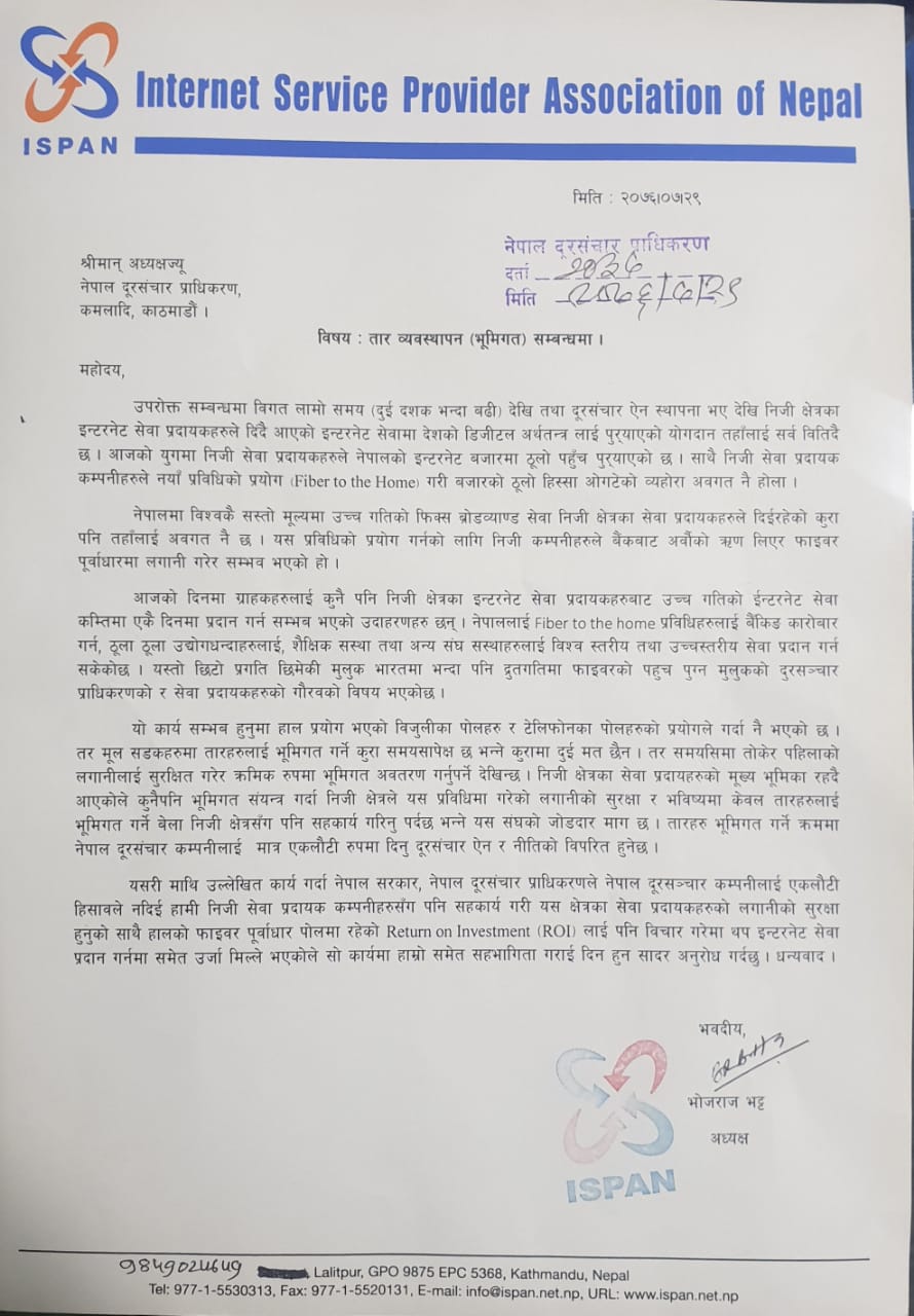 ‘नेपाललाई फाइबर टू दि होम प्रविधिहरुलाई बैंकिङ्ग कारोबार गर्न, ठूला ठूला उद्योगधन्दाहरुलाई, शैक्षिक संस्था तथा अन्य संघ संस्थाहरुलाई विश्व स्तरीय तथा उच्चस्तरीय सेवा प्रदान गर्न सकेको छ । यस्तो छिटो प्रगति छिमेकी मुलुक भारतमा भन्दा पनि द्रुतगतिमा फाइबरको पहुँच पुग्नु मुलुकको दुरसंचार प्राधिकरणको र सेवा प्रदायकहरुको गौरवको विषय भएको छ । यो कार्य संभव हुनुमा हाल प्रयोग भएको बिजुलीका पोलहरु र टेलिफोनका पोलहरुको प्रयोगले गर्दा नै भएको हो ।,’ इन्टरनेट सर्भिस प्रोभाइडर एसोसिएसन अफ नेपाल(आइस्पान)का अध्यक्ष भोजराज भट्टले दूरसंचार प्राधिकरणमा कात्तिक २९ गते बुझाएको पत्रमा उल्लेख छ ।