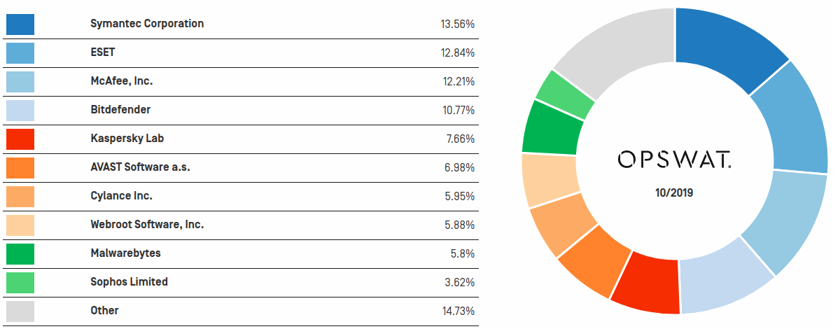 इन्टरप्राइज सफ्टवेयर भेण्डर ओपस्वाटको डाटाअनुसार यी कम्पनीका एन्टिभाइरस प्रोग्रामहरु सबैभन्दा धेरै प्रयोगमा रहेका छन् । सो कम्पनीले विगत ५ वर्षदेखि विण्डोज एन्टि मालवेयर मार्केटका लागि डाटा संकलन र रिपोर्ट सार्वजनिक गर्दै आएको छ ।
