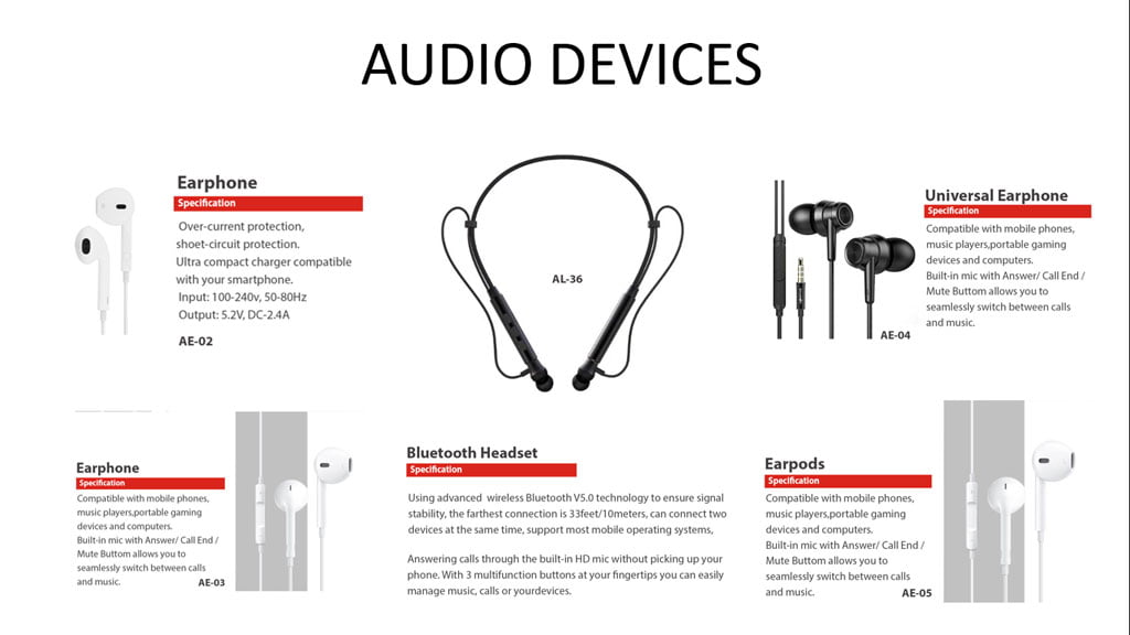 डाटा केबलतर्फ न्यूनतम २९९ रुपैयाँदेखि अधिकतम ३,४९ रुपैयाँसम्म रहेका छन भने ईयरफोनमा न्यूनतम २९९ रुपैयाँदेखि अधिकतम २,००० रुपैयाँसम्म रहेको छ ।