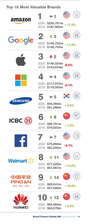विश्वको मूल्यबान ब्राण्डको टप टेन सूचीमा पहिलो पटक चिनियाँ टेलिकम उपकरण जायन्ट कम्पनी ह्वावे अटाएको छ । यसअघि गत वर्ष १२ औं स्थानमा रहेको ह्वावे यो वर्ष भने ४.५ प्रतिशतको ब्राण्ड भ्यालू बढाउँदै टप टेनमा आएको हो ।
