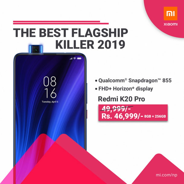 शाओमीले फ्ल्यागसीप किलर स्मार्टफोन रेडमी के२० प्रोमा रु ३००० को भारी छुटको घोषणा गरेको छ जसलाई अब रु ४६,९९९ मा खरिद गर्न सकिन्छ ।