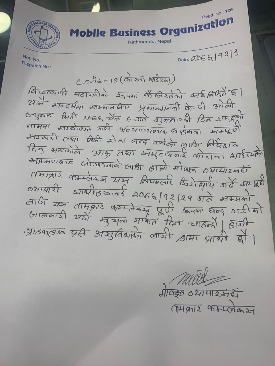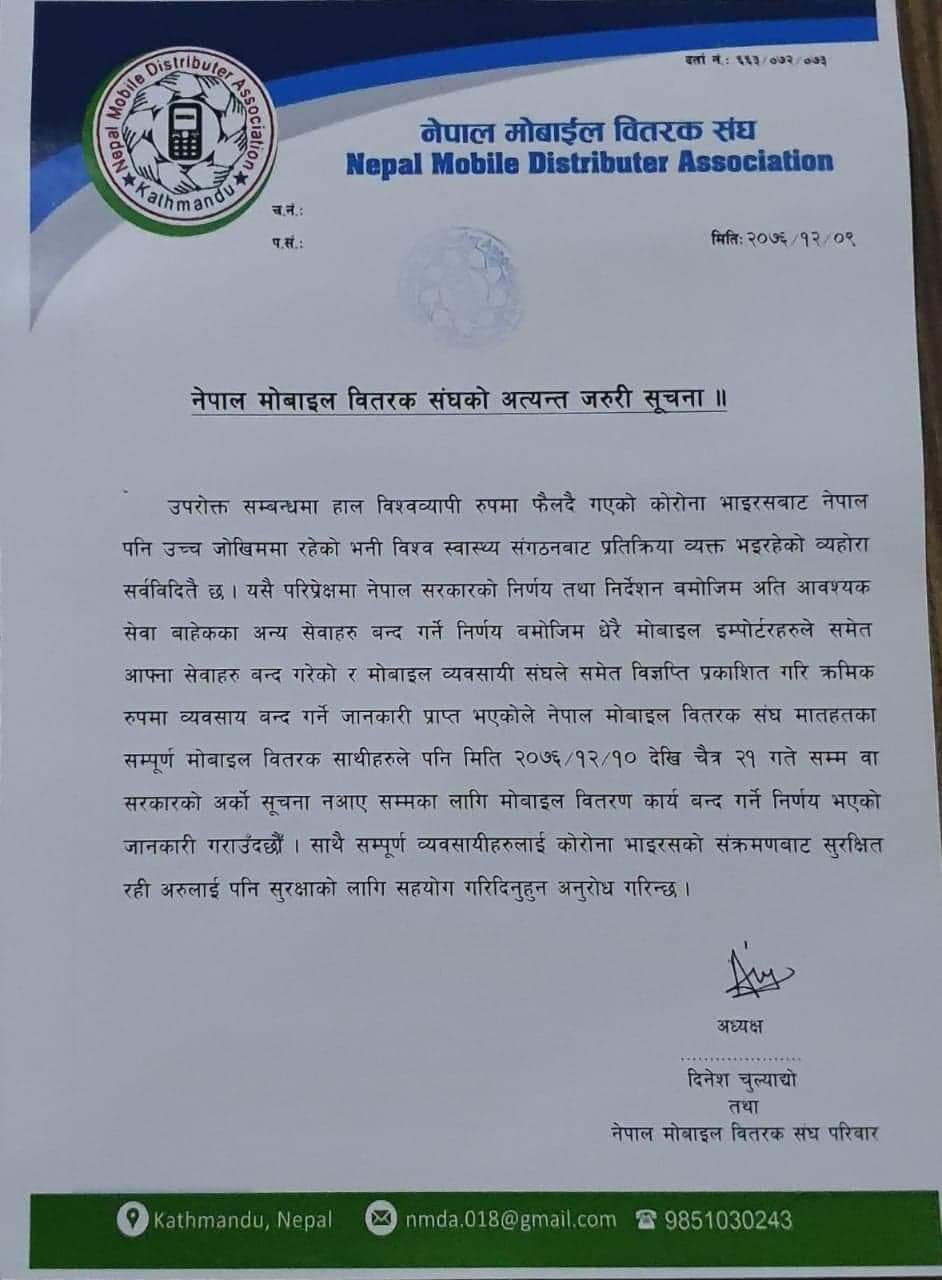 यसैगरि मोबाइल बिक्रीमा सहभागी हुने डिलरहरुको संस्था नेपाल मोबाईल बितरक संघले पनि कोरोनाभाइरसको कारण जोखिम हुनसक्ने भन्द मोबाइल बितरण कार्य बन्द गरेका छन् ।