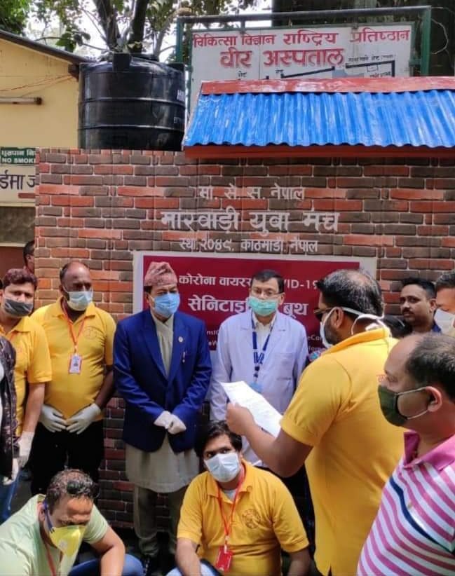 मारवाडी युवा मंचले स्वास्थ्यकर्मीहरुको सुरक्षालाई ध्यानमा राख्दै टेकु अस्पताल र वीर अस्पतालमा सेनिटाईजिङ बुथ स्थापना गरेर हस्तान्तरण गरेको छ ।
