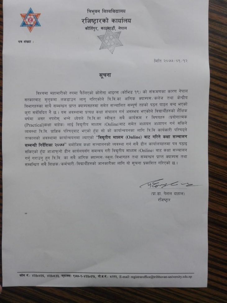विश्वविद्यालयका रजिस्ट्रार प्रा.डा. पेशल दाहालद्धारा जारी सूचनाअनुसार सबै डीन कार्यालयहरुमा कक्षा संचालनको व्यवस्थागर्न पत्र पठाईसकेको र डीन कार्यालयसँग समन्वयन गरी अनलाइन कक्षा संचालन गर्न भनिएको छ । पत्रअनुसार विश्वविद्यालयका सबै आंगिक क्याम्पस, स्कूल, विभागहरु तथा सम्बन्धन प्राप्त क्याम्पस तथा सम्बन्धित सबै शिक्षक कर्मचारी र विद्यार्थीहरुलाई अनलाइन कक्षाको बारेमा जानकारी गराईएको छ ।