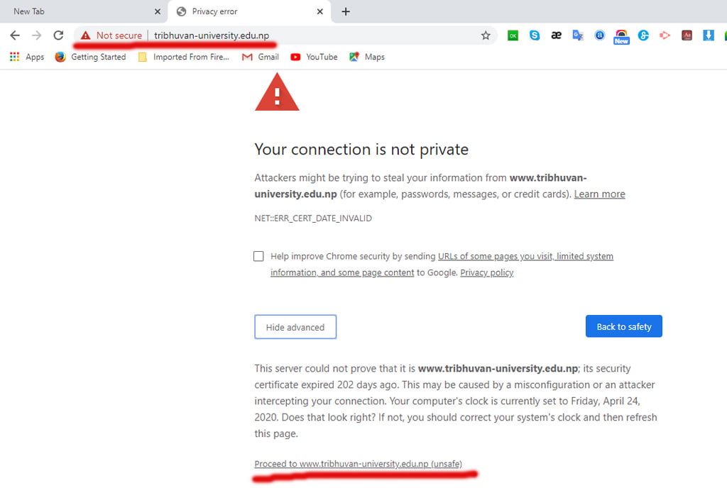 अनलाइन कक्षा संचालन गर्न लागेको त्रिभुवन विश्वविद्यालयको वेबसाइट नै असुरक्षित देखिएको छ । विश्वविद्यालयको वेबसाइट (https://www.tribhuvan-university.edu.np/) मा वेबसाइट सुरक्षाको लागि राखिने एचटिटिपिएसको प्रमाणिकता आधिकारीक नभएको देखिएको छ। विश्वभर कुनैपनि वेबसाइटलाई सुरक्षित बनाउन र राख्नका लागि प्रमाणित एचटिटिपिएस प्रयोग गर्ने गरिन्छ ।