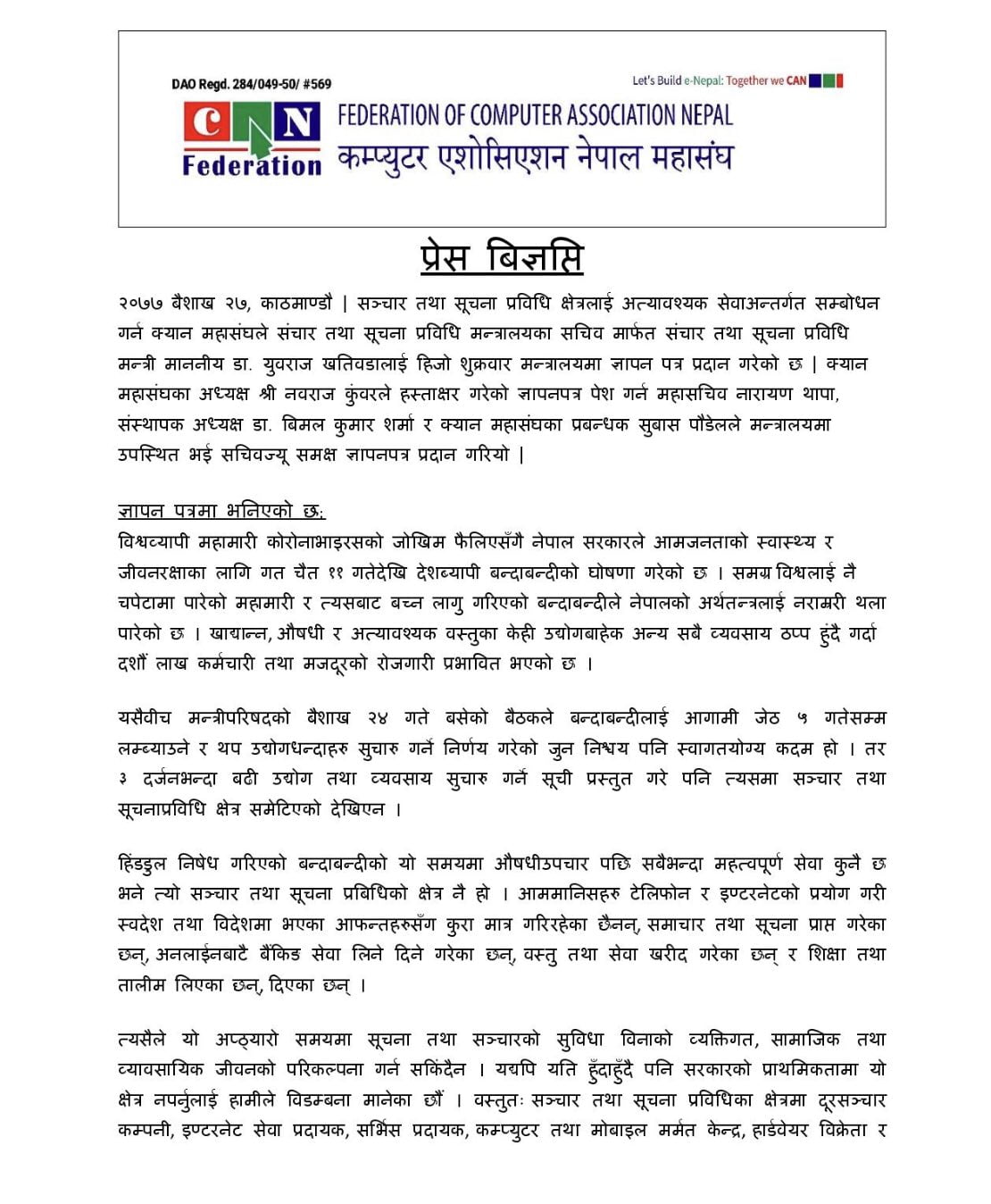 ‘इन्टरनेट सेवा अत्यावश्यक सेवामा रहेको भन्दै त्यसलाई सहित सूचना प्रविधि अन्तरगत हार्डवेयर तथा सफ्टवेयर मर्मत तथा सहयोग, बैंक, अस्पताल तथा खुला गरिएका उद्योगघन्दाहरुमा सेवा प्रदान गरिरहेका सेवा प्रदायक तथा उद्योग बिभागमा दर्ता भएका सूचना प्रविधि कम्पनीहरुलाई तत्कालै संचालनको वातावरण बनाईदिनुहुन अनुरोध गर्दछ,’ ज्ञापन पत्रमा भनिएको छ ।