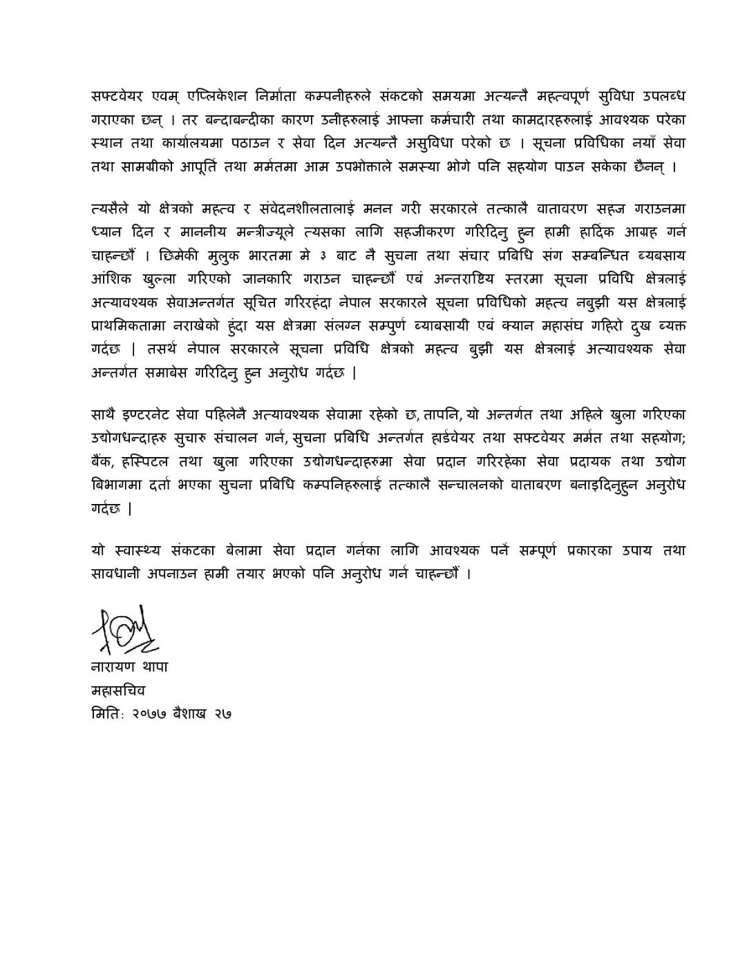 ज्ञापन पत्रमा हालै सरकारले अन्य उद्योग व्यवसायलाई संचालन गर्न दिने भनेपनि सूचना प्रविधि क्षेत्र नसमेटिएको भन्दै त्यसलाई अत्यावश्यक सेवाअन्तरगत राखेर खुला गर्न माग गरेको हो ।