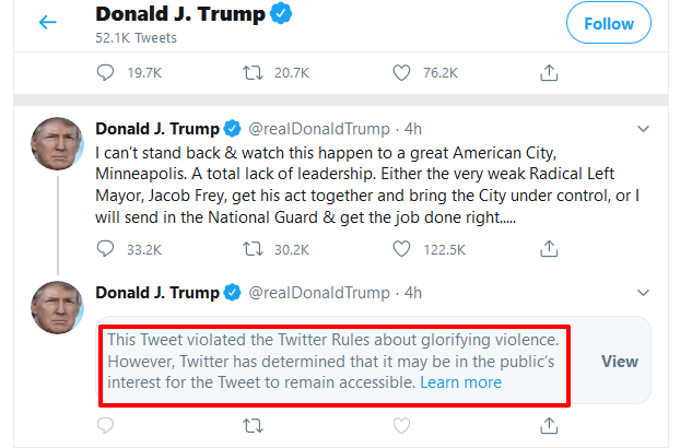 अमेरिकी राष्ट्रपतिले गरेको ट्वीटलाई लुकाईनुको कारणमा कम्पनीले यसो लेखेको छ- ‘यो ट्वीटले हिंसालाई बढावा दिँदै ट्विटरको नियमहरुलाई उल्लंघन गरेको छ । ट्विटरले यो सार्वजनिक चासोको लागि यो ट्वीटलाई अझै पहुँचयोग्य बनाउने निश्चित गरेको छ ।’
