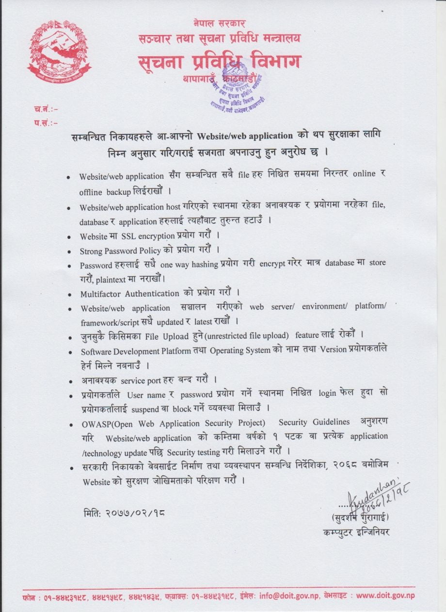 विभागले वेबसाइट तथा वेब एप्लिकेसनको सुरक्षाका लागि सेक्यूरिटी अडिटदेखि पासवर्ड राख्ने तथा फाईल अपलोडसम्मका सुरक्षात्मक १३ बुँदे उपायहरु अपनाउनका लागि सबैलाई भनेको छ ।