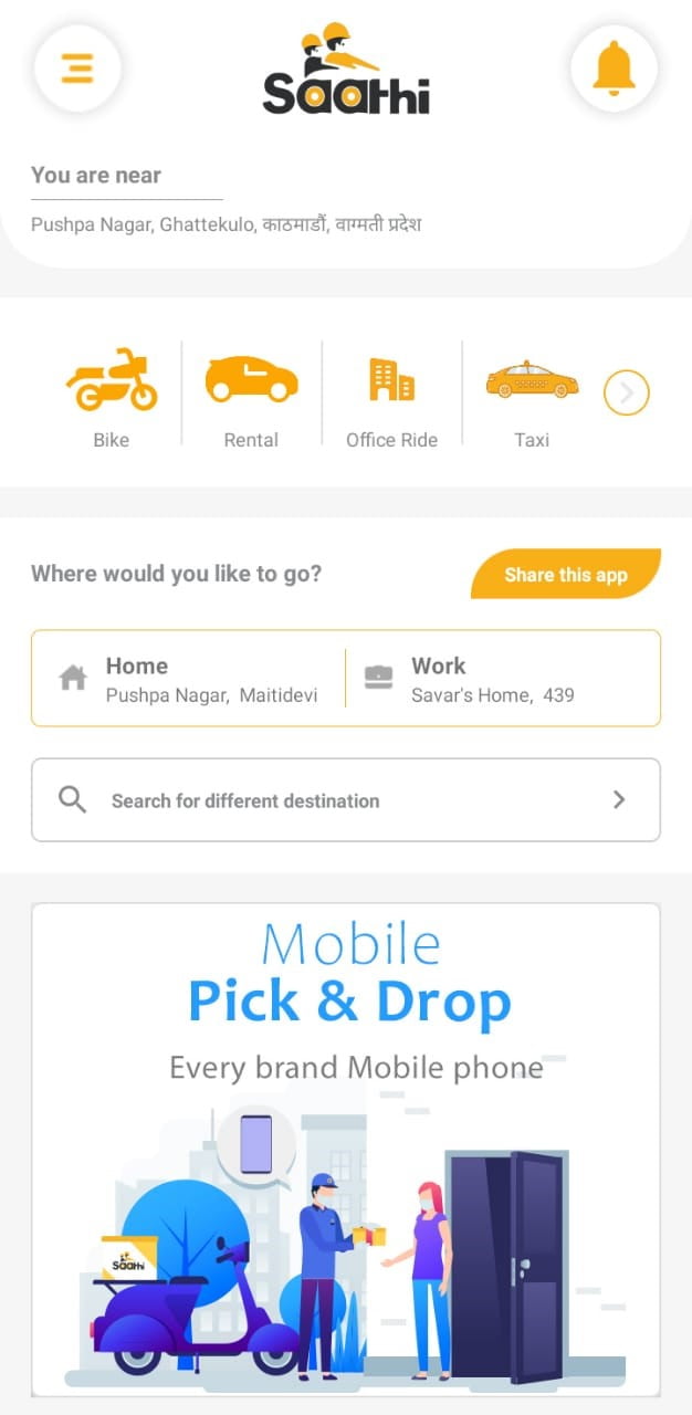 कोभिड १९ महामारीले गर्दा देशभर लकडाउनको अवस्था रहेको र संक्रमणबाट बच्नुपर्ने साथै सुरक्षित हुनुपर्ने अवस्थालाई मध्यनजर गरेर भर्खरै संचालनमा आएको राइड सेयरिङ्ग एप साथीले मोबाइल फोन पिकअप र ड्रप गर्ने नयाँ सेवा शुरु गरेको हो ।
