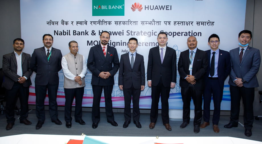 नबिल बैंकका प्रमुख कार्यकारी अधिकृत अनिल शाह र ह्वावे टेक्नोलोजीज नेपालका प्रमुख कार्यकारी अधिकृत डेंग शुइगेन नबिल बैंकका लागि क्लाउड डिजिटलकरण सेवाको बारेमा छलफल गर्ने सम्झौता पत्रमा हस्ताक्षर गरेका छन् । वित्त सेवा व्यापार शाखा, ह्वावे इन्टरप्राइज बीजी का अध्यक्ष चाओ चोंग र अन्य प्रतिनिधिहरूले उक्त कार्यक्रममा साक्षीको रूपमा सहभागी थिए ।