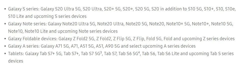 ग्यालेक्सी एस १० सिरिजदेखि ग्यालेक्सी एससम्मका सबै एन्ड्रोइड फोनहरुका लागि सामसङले अपडेट दिनेछ । यो सूचीमा एस १० सिरिज, एस २० सिरिज र नयाँ आउने डिभाइसहरु हुनेछन् ।