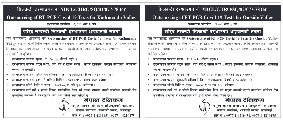नेपाल दूरसञ्चार कम्पनी लिमिटेडले हालै सार्वजनिक सूचना जारी गर्दै कर्मचारीहरुको पीसीआर परीक्षण गराउनका लागि टेण्डर माग गरेको छ ।
