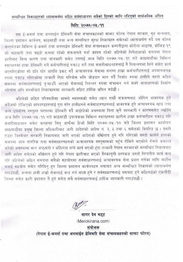 ईकमर्श तथा अनलाइन डेलिभरी कम्पनीहरुको संस्था नेपाल ईकमर्श तथा अनलाईन डेलिभरी सेवा संचालकहरुको साझा फोरमले सो बारेमा सार्वजनिक अपिल गर्दै तत्काल पक्राउ परेका लागि रिहा गर्दै सेवा संचालनगर्ने वातावरण बनाउन माग गरेकोछ ।