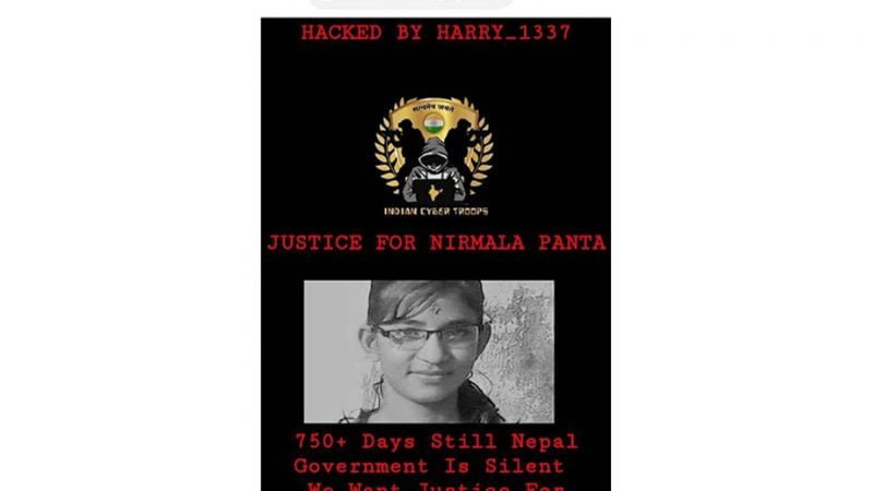 बलात्कारपछी हत्या गरिएकी कन्चनपुरकी निर्मला पन्तलाई न्याय दिनुपर्ने माग गर्दै ह्याकरहरुले महिला जागरण तथा विकास केन्द्रको वेबसाइट ह्याक गरेका छन् । भारतीय साइबर ह्याकरहरुको समूह इन्डियन साइबर ट्रुप्सले निर्मला पन्तको … Continue reading निर्मला पन्तलाई न्याय दिन माग गर्दै महिला जागरण तथा विकास केन्द्रको वेबसाइट ह्याक