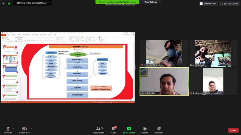आइएमई जनरल इन्स्योरेन्स लिमिटेडले विश्वव्यापि महामारीको रुपमा फैलिएको कोरोना भाईरस (कोभड-१९) को असर र काठमाडौं उपत्यका लगायत देशको मुख्य मुख्य शहरहरुमा स्थानीय प्रशासनले निषेधाज्ञा जारी गरेको यस विषम परिस्थितिमा पनि आफ्ना अभिकर्ताहरुलाई भर्चुअल तालिमको आयोजना गरेको छ ।