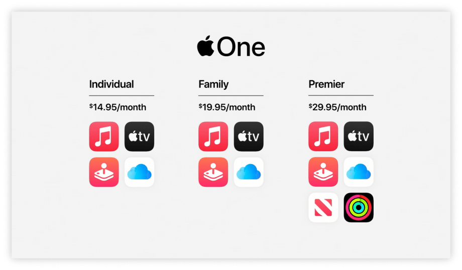 एप्पल वन तीन विकल्पमा उपलब्ध हुनेछ।जसअन्तरगत एप्पल वन व्यक्तिगत सदस्यता पारिवारिक सदस्यता र प्रिमियर सेवा उपलब्ध हुनेछ ।
