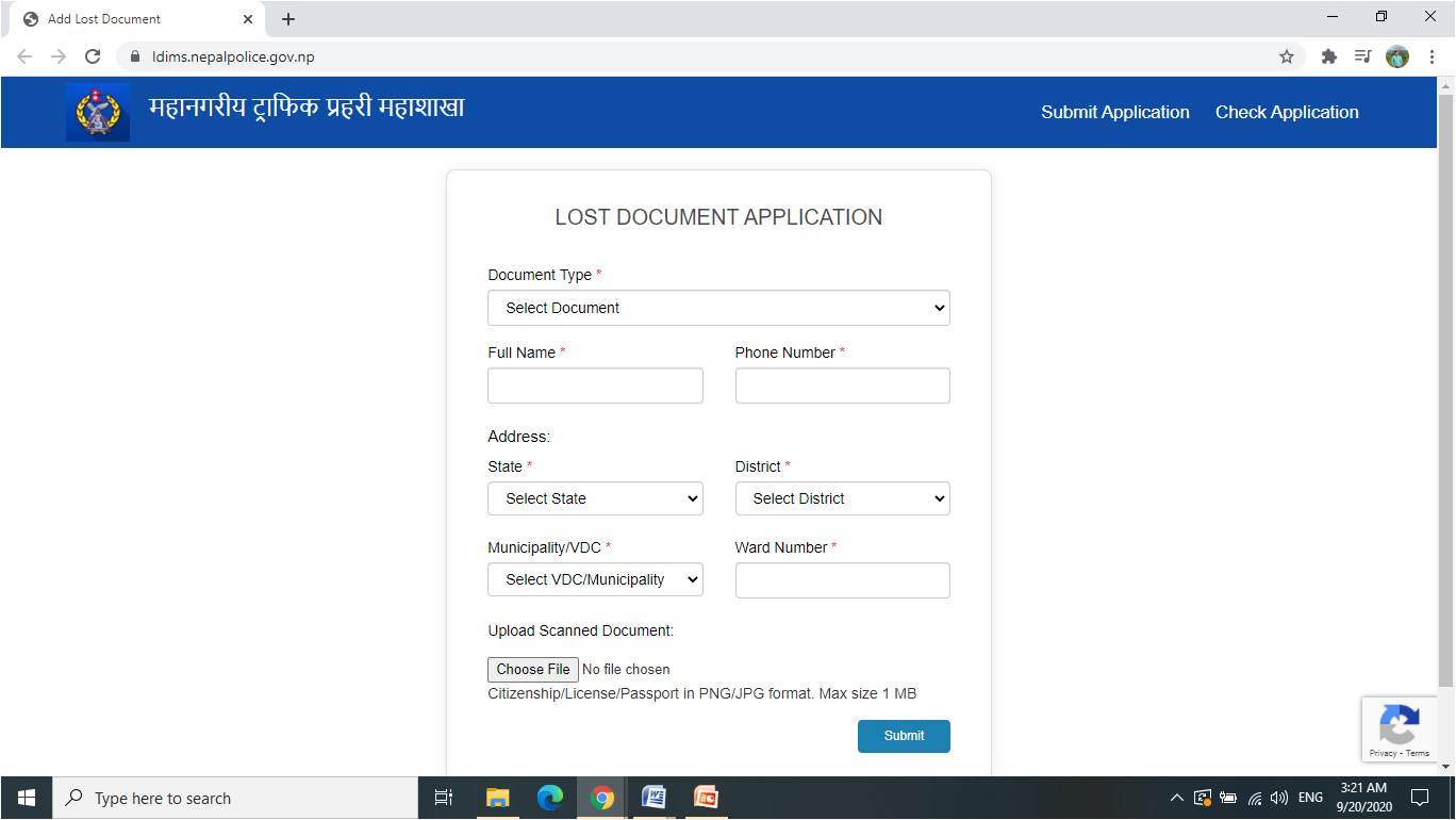 यस्तै, सेवाग्राहीले एप्लिकेसनमा क्लिक गरेपछि कुन हराएको डकुमेन्ट्सको सिफारिस आवश्यक परेको हो त्यो सेलेक्ट गर्नुपर्नेछ । त्यसपछि निवेदकको नाम फोन नम्बर, ठेगाना र आफ्नो परिचय खुल्ने नागरिकता वा लाईसेन्स वा पासपोर्टको फाईल वा स्क्यान कपि सेवाग्राहीले अनलाइन प्रणालीबाटै दिनुपर्ने हुन्छ ।