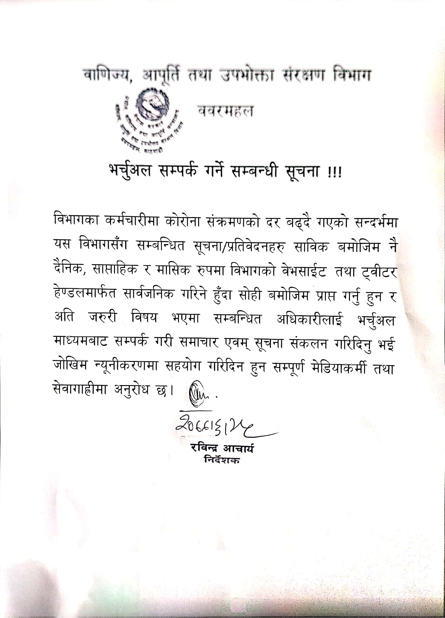 ‘विभागका कर्मचारीमा कोरोना संक्रमणको दर बढ्दै गएको सन्दर्भमा यस विभागसँग सम्बन्धित सूचना र प्रतिवेदनहरु साविक बमोजिम नै दैनिक, साप्ताहिक र मासिक रुपमा विभागको वेभसाईट तथा ट्वीटर हेण्डलमार्फत सार्वजनिक गरिने हुँदा सोही बमोजिम प्राप्त गर्नु हुन र अति जरुरी विषय भएमा सम्बन्धित अधिकारीलाई भर्चुअल माध्यमबाट सम्पर्क गरी समाचार एवम् सूचना संकलन गरिदिनु भई जोखिम न्यूनिकरणमा सहयोग गरिदिनुहुन सम्पूर्ण मिडियाकर्मी तथा सेवाग्राहीमा अनुरोध छ’ विभागद्धारा जारी सूचनामा भनिएको छ ।