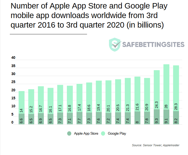 वर्षको सुरूदेखि नै गूगल प्ले मा एक ठूलो ८०.६ अरब एपहरू डाउनलोड गरिएका थिए, जबकि एप स्टोरले संयुक्त तीन क्वार्टरमा २६.६ अर्ब डाउनलोडहरू मात्र देखेको थियो।