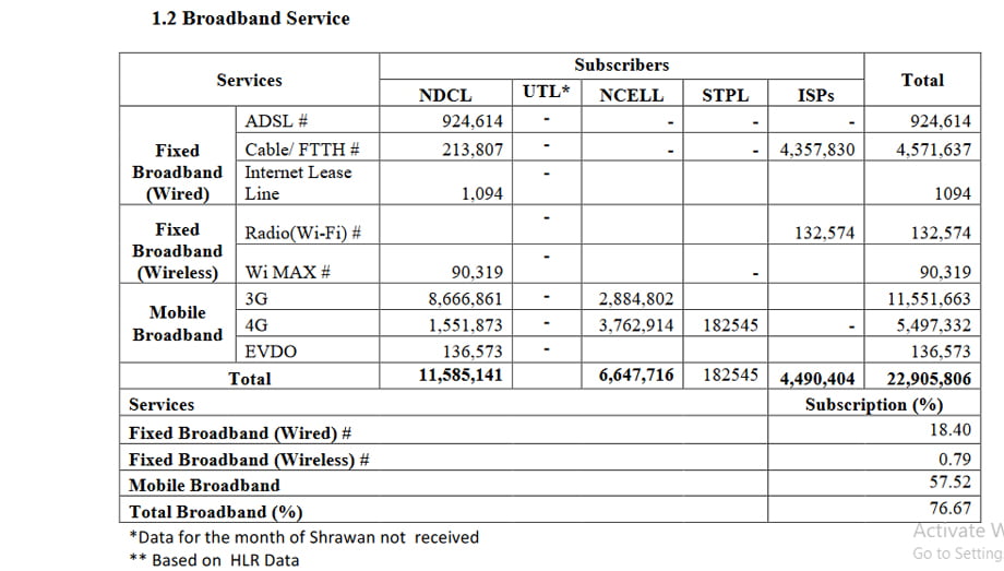 नेपाल दूरसञ्चार प्राधिकरणबाट हालै सार्वजनिक साउन महिनाको एमआईएस रिपोर्टअनुसार कम्पनीले २ लाख १३ हजार ८०७ जना ग्राहकहरु फिक्स्ड ब्रोडब्याण्डअन्तरगत एफटीटीएच सेवामा पुर्याएको हो ।