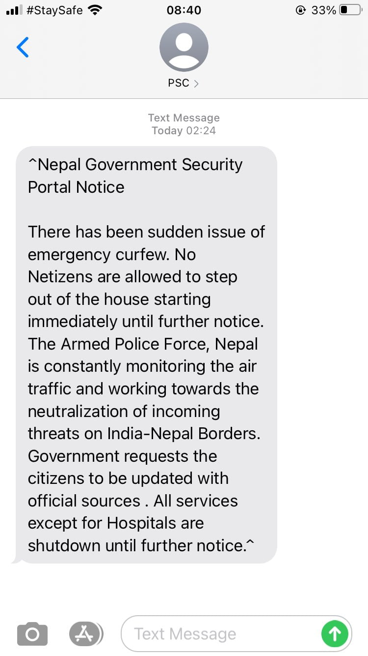 सो एसएमएस नेपाल गर्भनमेन्ट सेक्यूरिटी पोर्टल नोटिसको नाममा ग्राहकहरुलाई पठाईएको थियो । जसमा नेटिजनहरुलाई घर बाहिर नजान र ससस्त्र प्रहरी फोर्सले निरन्तर हवाई उडान अनुगमन गरिरहेको तथा नेपाल भारत सीमामा देखिएको जोखिमलाई न्यून गर्ने काम गरिरहेको बताईएको छ ।