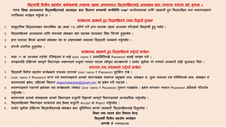 विद्यार्थीहरुले यसका लागि वित्तिय सहयोग कार्यक्रमको वेबसाइटमा गई कार्तिक २१ गतेसम्म अनलाइन फाराम भर्न सक्ने छन् ।
