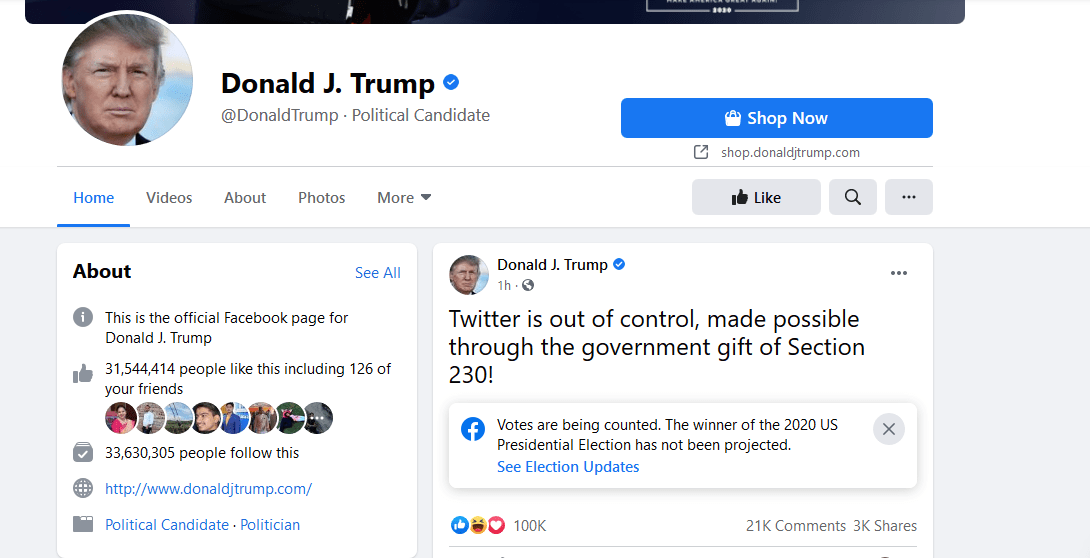 उता फेसबुकले समेत राष्ट्रपति ट्रम्पका हरेक पोस्टहरुमा निर्वाचन आचारसंहिताअन्तरगत तथ्यगत जानकारीहरु राखिदिएको छ । उनले भनेका दाबीहरु सहितको पोस्टलाई खण्डन हुने गरि फेसबुकले सोहि पोस्टको तल भागमा सहि जानकारी लिंकसहित राखिदिएको छ ।