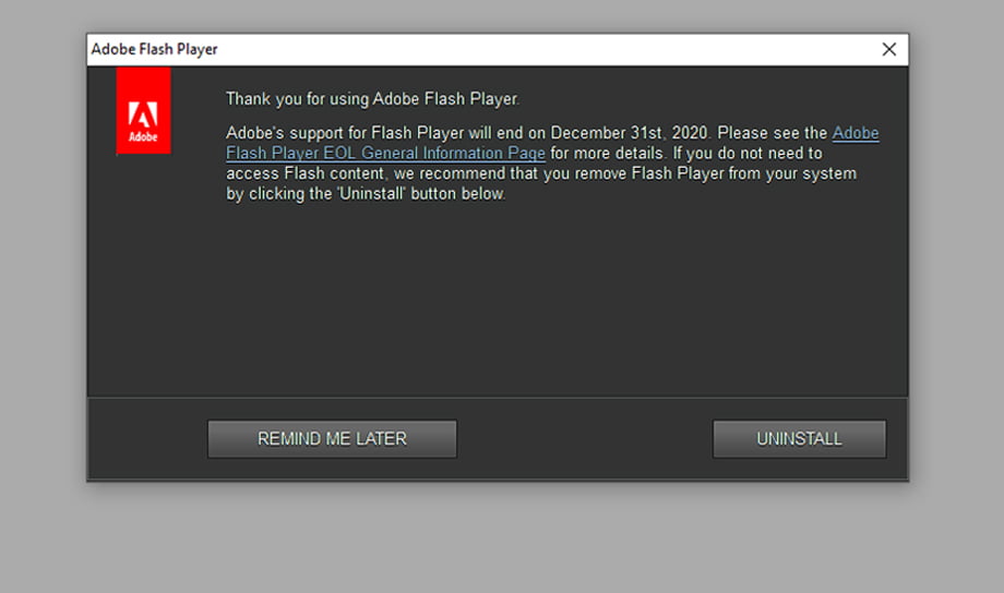कम्पनीले प्रयोगकर्ताहरूलाई अन्तिम सपोर्टमा पुग्नु अघि नै उनीहरूको फ्ल्यास प्लेयर अनइन्स्टल गर्न भनेको छ।