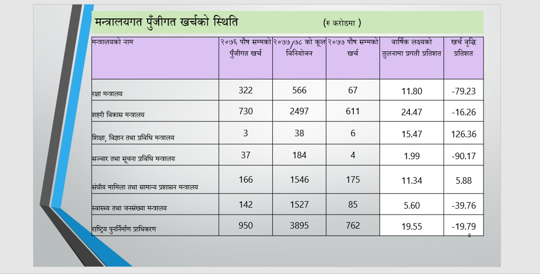 त्यसमा मन्त्रालयले हालसम्म जम्मा ४ करोड रुपैयाँ मात्र खर्च गर्न सकेको हो । अघिल्लो वर्षको सोहि अवधिमा मन्त्रालयले ३७ करोड रुपैयाँ खर्च गरेको थियो । गत वर्षको तुलनामा यो वर्ष पूँजीगत खर्चको दरमा ९० प्रतिशतले कमी आएको छ ।