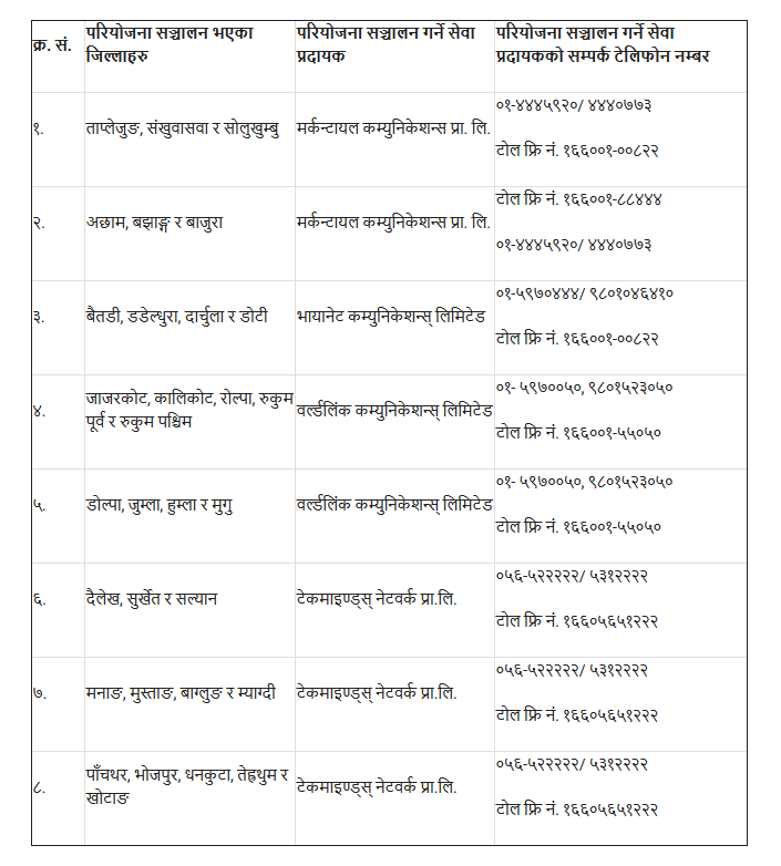 उल्लेखित जिल्लाहरुमध्ये ताप्लेजुङ, संखुवासभा, सोलुखुम्बु, अछाम, बझाङ्ग र बाजुरामा मर्कन्टाइल कम्युनिकेसन्स प्रालिले ब्रोडब्याण्ड नेटवर्क निर्माणको काम सम्पन्न गरि परियोजना सञ्चालन गरेको छ भने बैतडी, डढेल्धुरा, दार्चुला, डोटीमा भायानेट कम्युनिकेसन्स लिमिटेडले काम सम्पन्न गरि परियोजना सञ्चालन गरेको छ ।