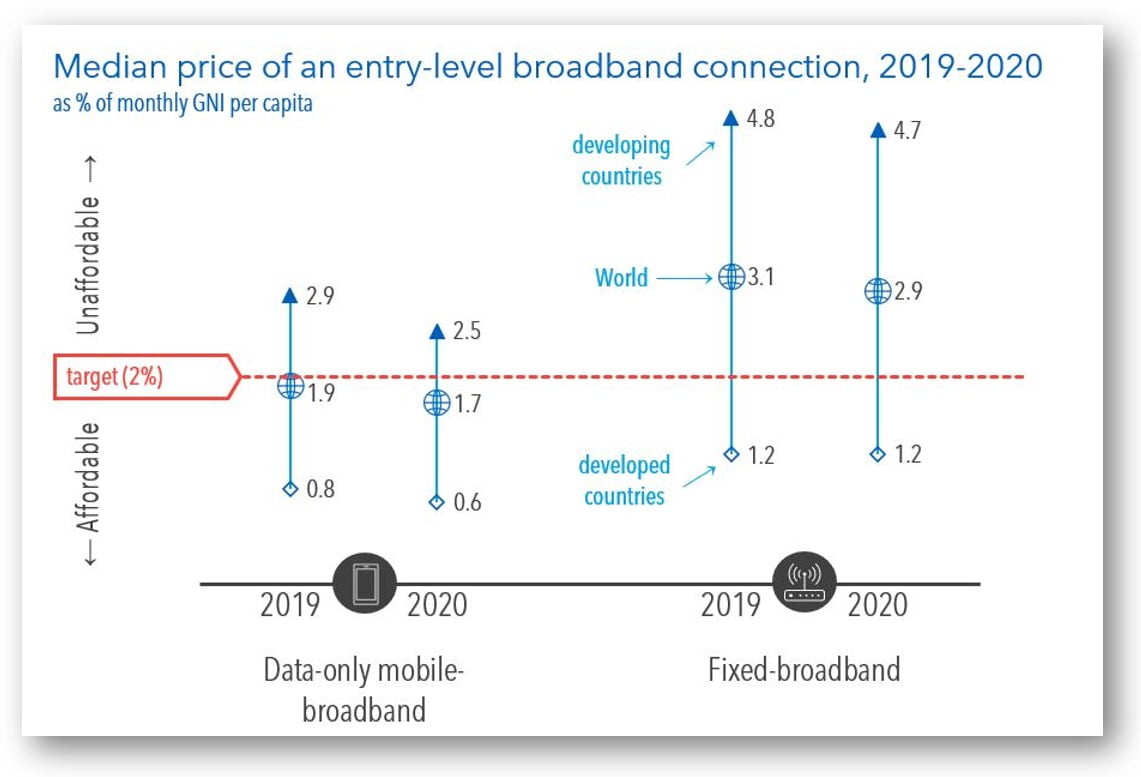 तथ्यांकअनुसार विश्वभर मोबाइल र फिक्स्ड ब्रोडब्याण्डको मूल्य ०.२ प्रतिशतले घटेको छ भने अझैपनि ८४ देशहरुको मूल्य मोबाइल ब्रोडब्याण्डको शुल्कमा लक्ष्य गरिएको २ प्रतिशत भन्दा माथि रहेको छ ।