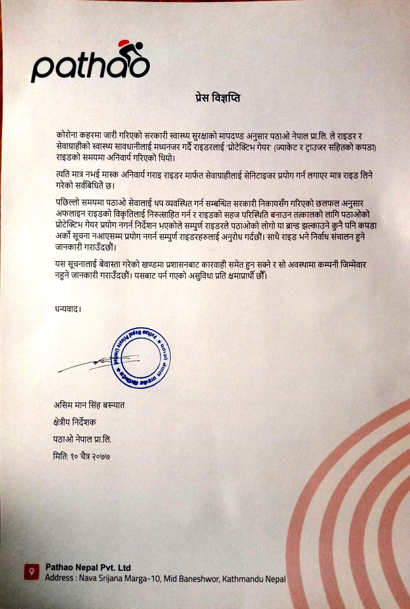 पछिल्लो समयमा पठाओ सेवालाई थप ब्यवस्थित गर्न सम्बन्धित सरकारी निकायसँग गरिएको छलफल अनुसार अफलाइन राइडको बिकृतीलाई निरुत्साहित गर्न र राइडको सहज परिस्थिति बनाउन तत्कालको लागि पठाओको प्रोटेक्टिभ गेयर प्रयोग नगर्न निर्देशन भएकोले सम्पुर्ण राइडरले पठाओको लोगो या ब्रान्ड झल्काउने कुनै पनि कपडा अर्को सूचना नआएसम्म प्रयोग नगर्न अनुरोध गरिएको पठाओ नेपाल प्रालिका क्षेत्रिय निर्देशक असिम मान सिंह बस्न्यातद्वारा हस्ताक्षरित बिज्ञप्तिमा बताइएको छ। साथै राइड सेवा भने निर्वाध चल्ने भनिएको छ।