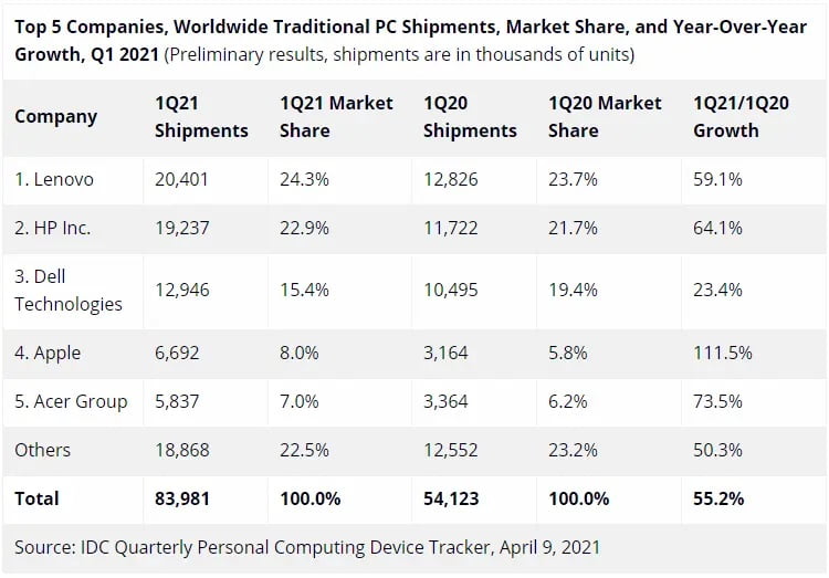 जनवरीदेखि मार्चसम्मको अवधिमा विश्वभरमा ८३.९८ प्रतिशत अर्थात् ५४ करोड १२ लाख थान पर्सनल कम्प्युटर बिक्री भएका थिए। यो गत वर्षको पहिलो त्रैमासको तुलनामा ५५.२ प्रतिशतले धेरै हो।