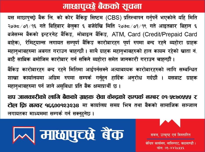 माछापुच्छ्रे बैंक लिमिटेडको सम्पूर्ण बैंकिङ सेवाहरु यहि बैशाख १७ गते शुक्रबार र १८ गते शनिबार पूर्णरुपमा बन्द हुने भएको छ।